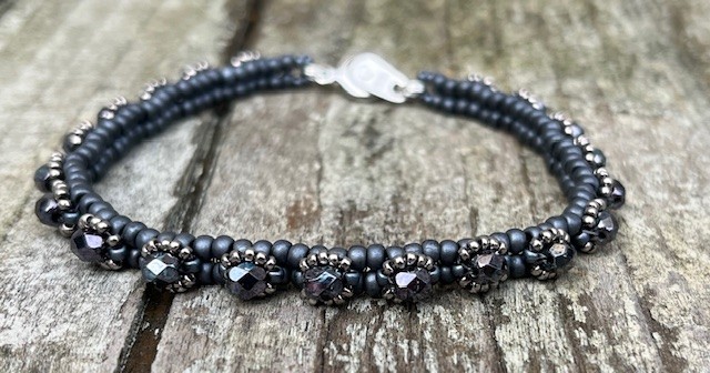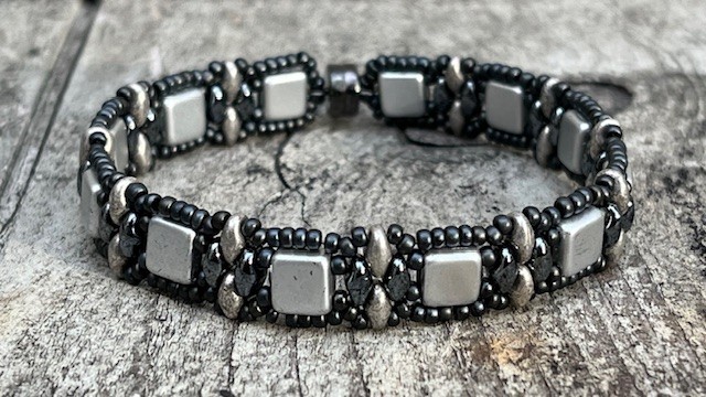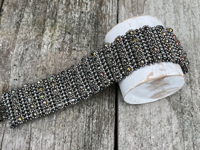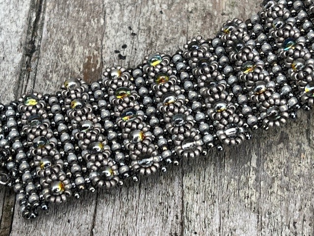 Deze prachtige armband is gemaakt naar een patroon van Sabine Lippert uit één van haar boeken. De armband bestaat uit heel veel donkergrijze (bijna zwarte) en lichter grijze kleine Japanse Miyuki kraaltjes welke min of meer de basis van de armband vormen. Daar bovenop liggen weer de druppelkraaltjes in een zilverkleur omrand met mat nikkelkleurige kleine Miyuki kraaltjes.