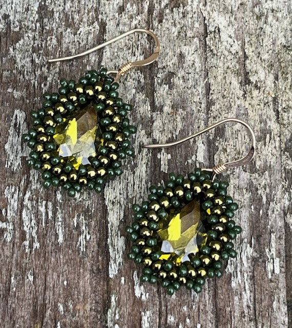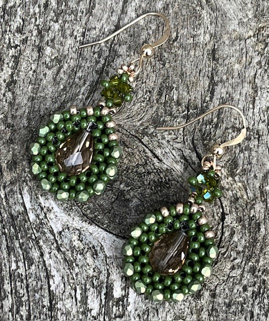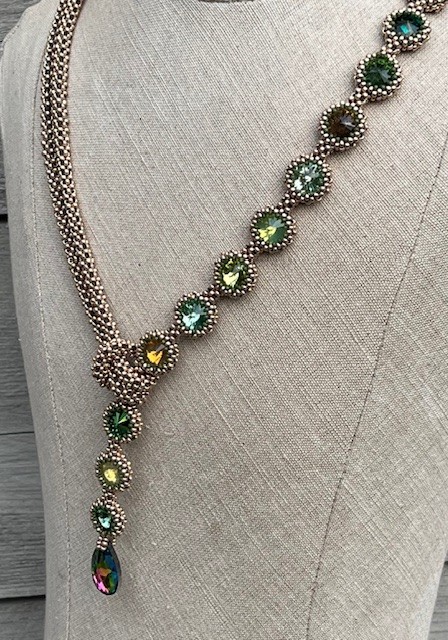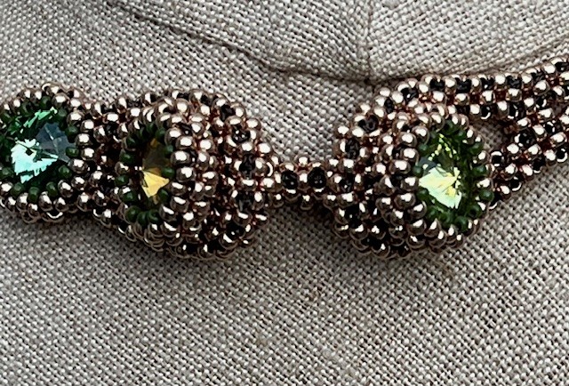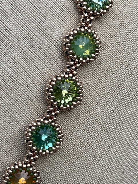 Deze keer bestaat deze Bling ketting uit een combinatie van zowel acryl rivoli’s als Swarovski rivoli’s. In totaal 17 stuks in diverse tinten van diepgroen tot licht bronze/goud. Al deze rivoli’s zijn omrand met kleine Japanse Miyuki kraaltjes in de kleur champagne (licht goud) en avocado groen. De gehele linkerzijde (kettingdeel) van deze ketting is met deze zelfde kralen gemaakt.