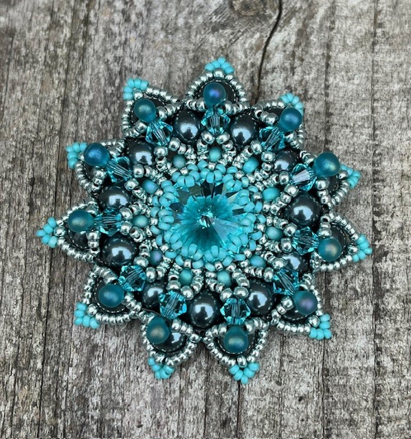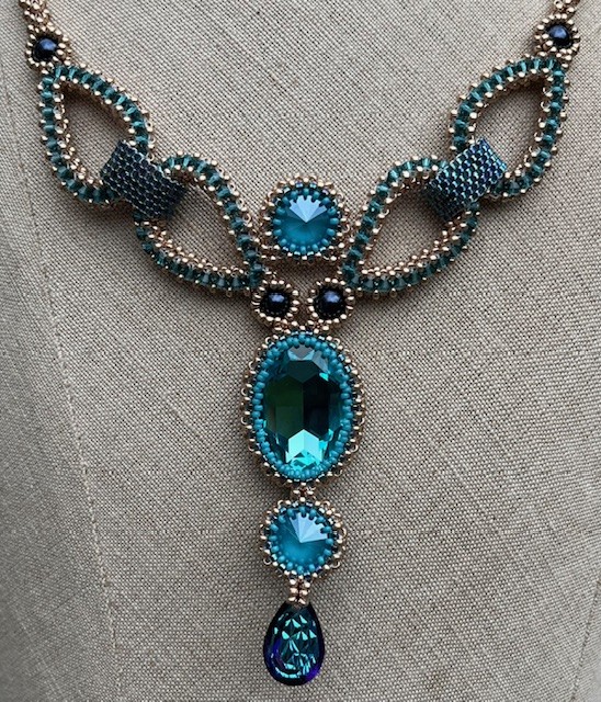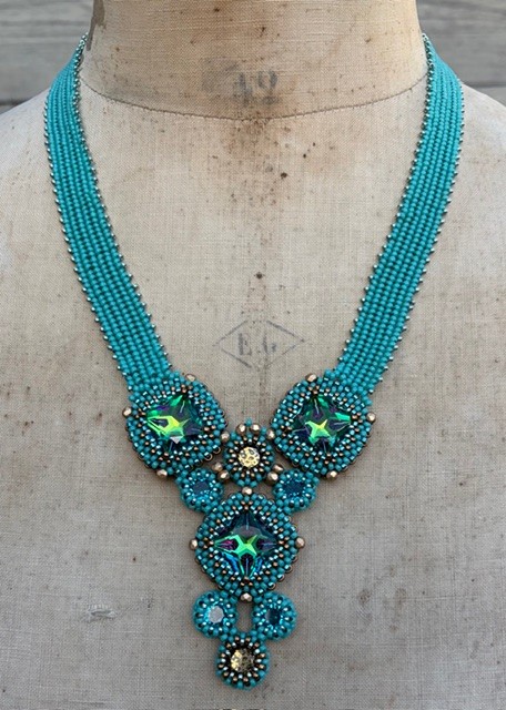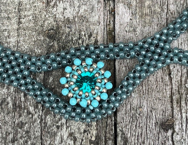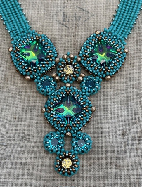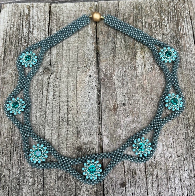 Deze bijzondere ketting is gemaakt naar een patroon van Natscha kralen. De ketting bestaat uit 7 emeraldkleurige (of donker turquoise) Swarovski chatons (dat zijn die bling stenen) welke allen omrand zijn met diverse maten kleine Japanse Miyuki kraaltjes in turquoise en een beetje goud en hele mooie kleine turquoise Tsjechische glaspareltjes. Al deze chatons zijn gevat in een patroon van eucalypstus kleurige Miyuki kralen en hierdoor ontstaat deze prachtige ketting waarbij de chatons als ‘ogen’ eruit springen.