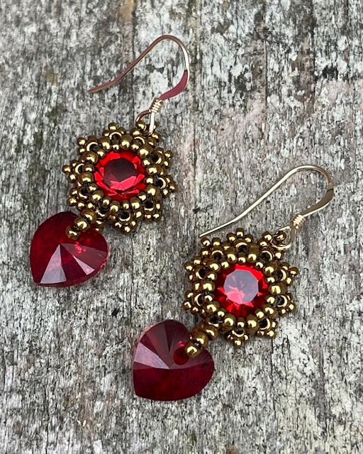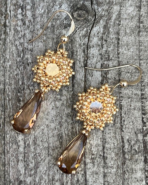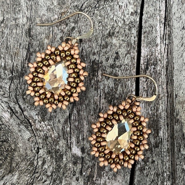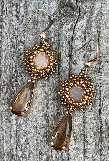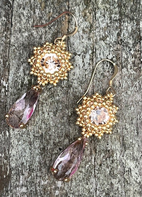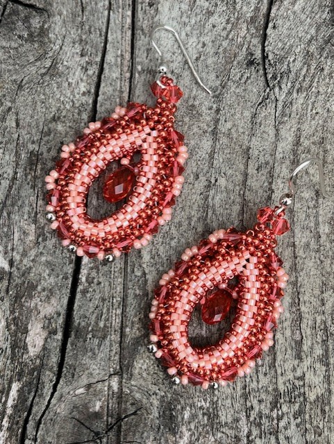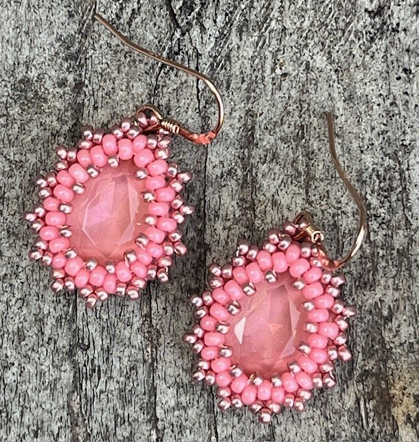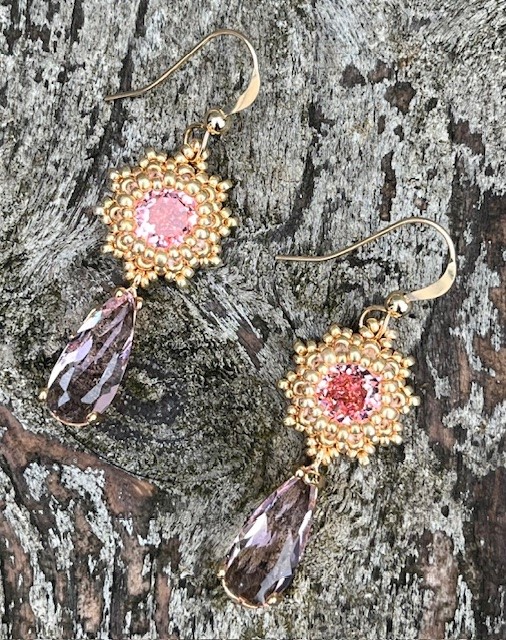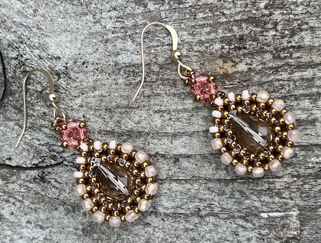 De basis van het patroon zijn de mooie ‘gekraalde’ druppels welke gemaakt zijn met de zgn. craw techniek, maar dan niet alleen met de kleine kraaltjes, maar ook met fuchsiaroze Swarovski bicone steentjes. Dit geeft het gelijk een lekker hoog bling gehalte. Bovenaan deze druppels zitten ook nog koperkleurige Swarovski parels.