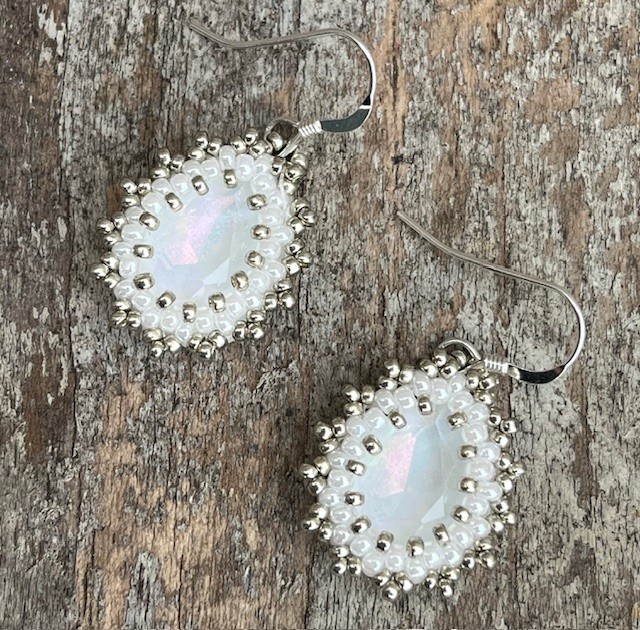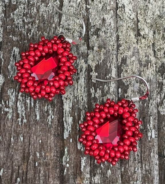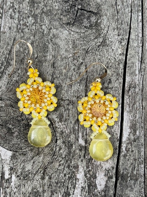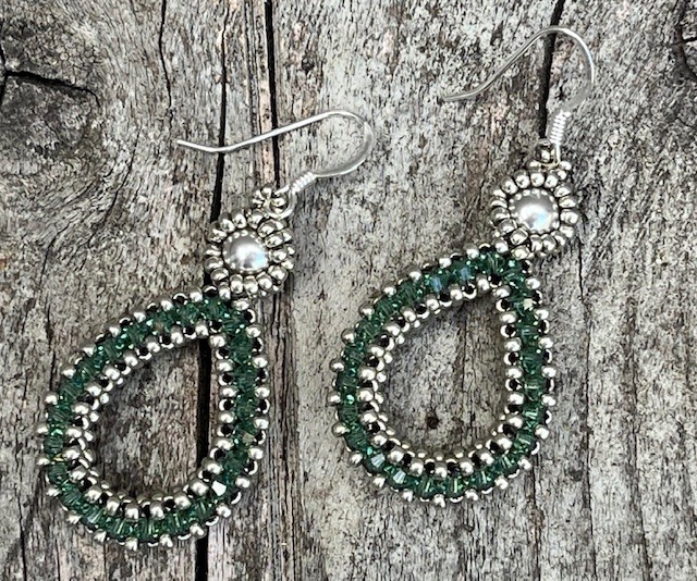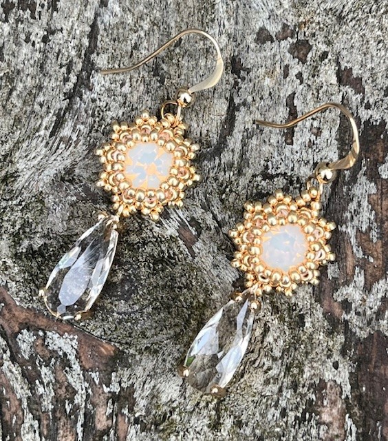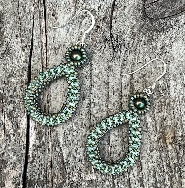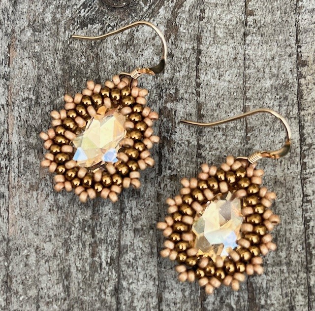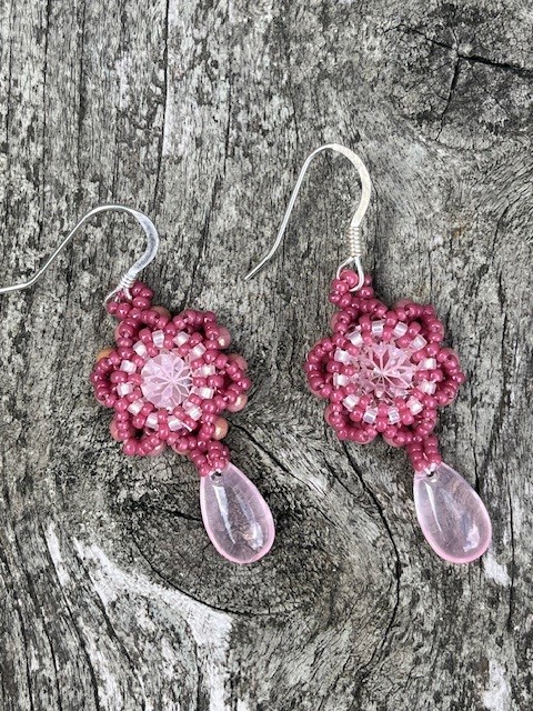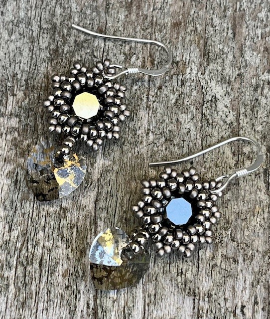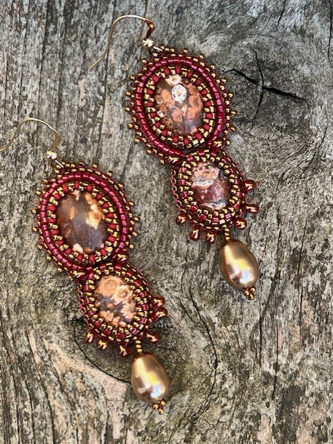Deze mooie bijzondere ketting en oorbellen zijn gemaakt naar een patroon van Cora Bartels-Sparidaans. Dit patroon was onderdeel van de beadalong van april 2025 van de ‘Seed Beads and More’ groep.