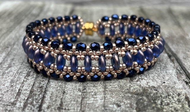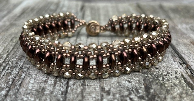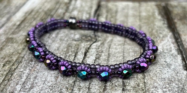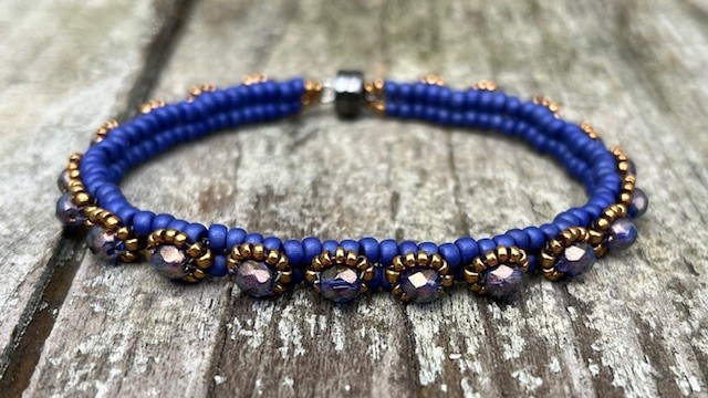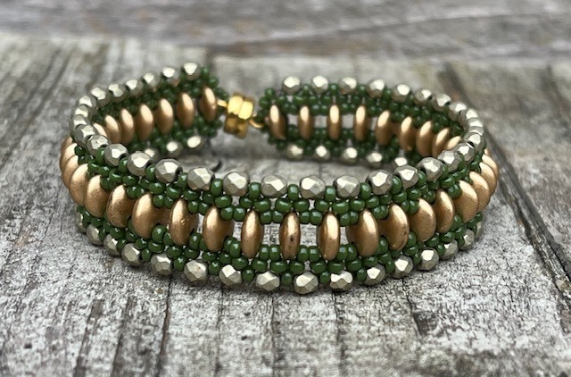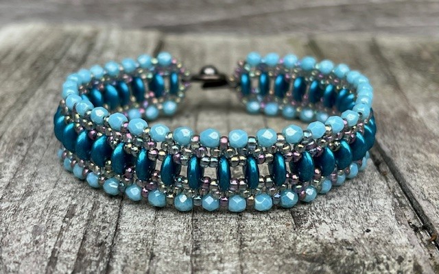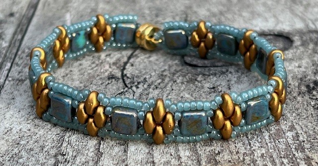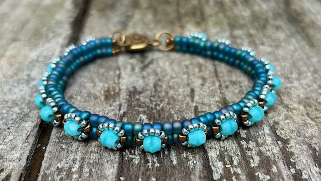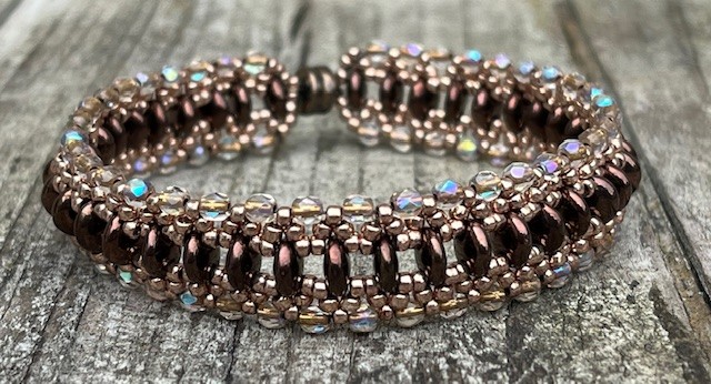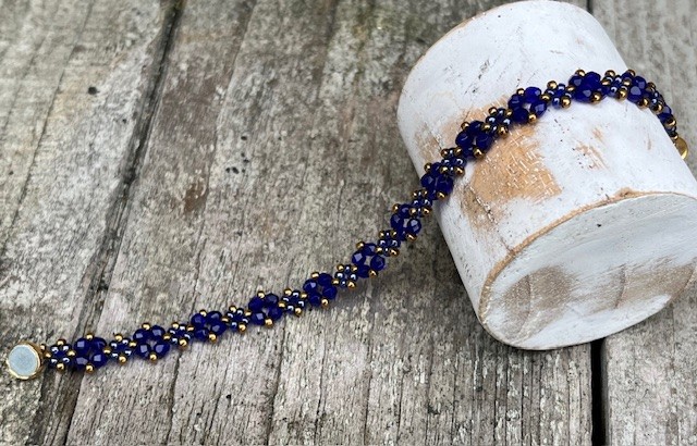 Het armbandje bestaat uit leuke ronde Tsjechische Lentil kralen in het midden waaromheen volgens een patroon kleine Japanse Miyuki kraaltjes geregen zijn en een buitenste rand van Tsjechische facet kralen. De armbanden sluiten met een bijpassend magneetslotje (zeer stevig), of een zgn. drukknoopslotje.