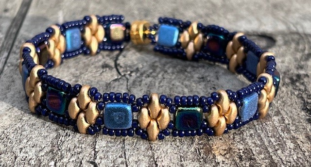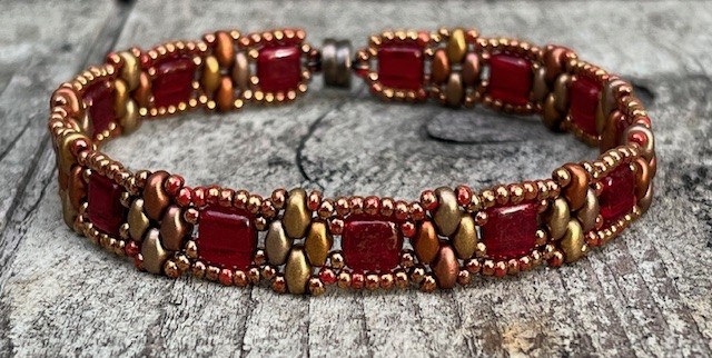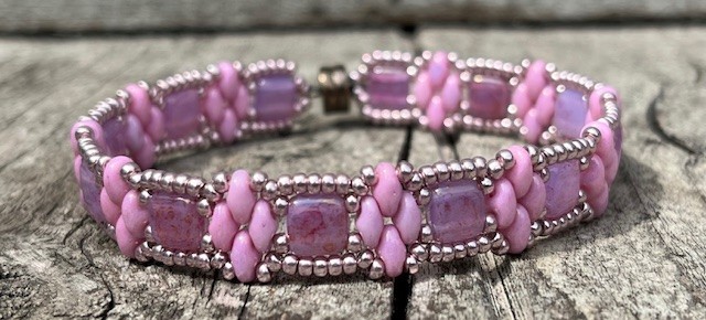 De armbanden zijn gemaakt met vierkante zogenaamde Silky beads, en daaromheen en tussenin zitten superduo kralen, kleine Japanse Miyuki en/of Toho kraaltjes in 2 verschillende maten en kleuren en er zijn nog kleine Tsjechische glaspareltjes in verwerkt. Alles in bij elkaar passende kleurtjes natuurlijk.
