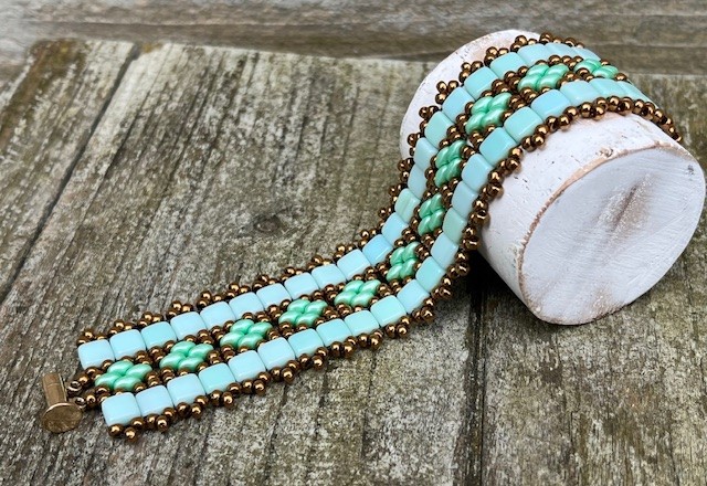 Deze armband bestaat uit mintgroene vierkante zgn. Tsjechische tile beads aan de randen en in het midden een patroon van bronzen Toho kraaltjes en mintgroene superduo beads. De franje langs de rand is weer gemaakt met de bronzen kraaltjes. Afgewerkt met een licht goudkleurig insteekslotje.