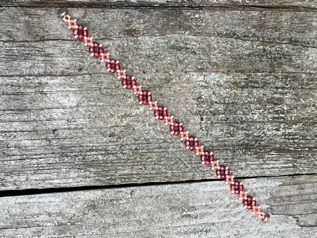 Armband Valerie is een eenvoudig armbandje wat bestaat uit 2 verschillende kleuren Miyuki kraaltjes in combinatie met Tsjechische facet kraaltjes. Dit samen geregen in een leuk patroon maakt het een mooi fijn armbandje wat lekker licht draagt.