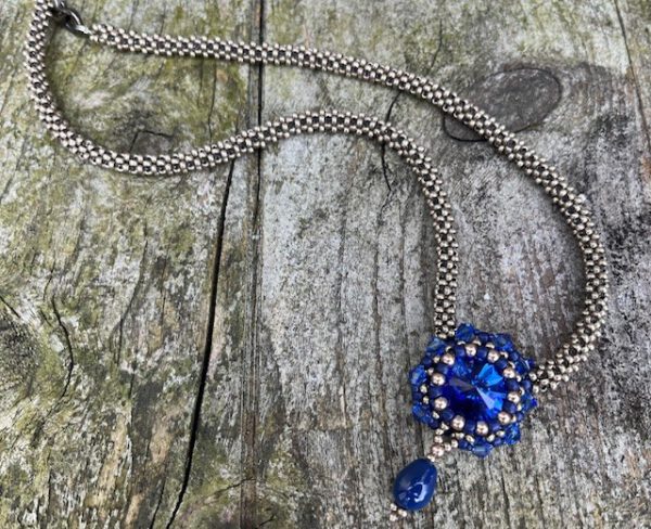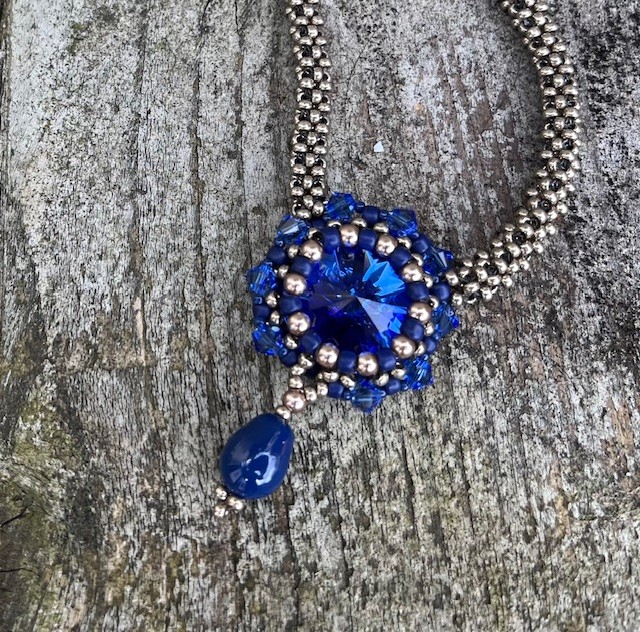 De hanger onderaan de ketting bestaat uit een prachtige groteĀ Swarovski rivoli steen welke omrand is met diverse soorten en kleuren Japanse Miyuki kraaltjes, Swarovski bicone kraaltjes en Swarovski pareltjes. Onderaan de hanger nog een prachtige blauwe Swarovski pareldruppel.