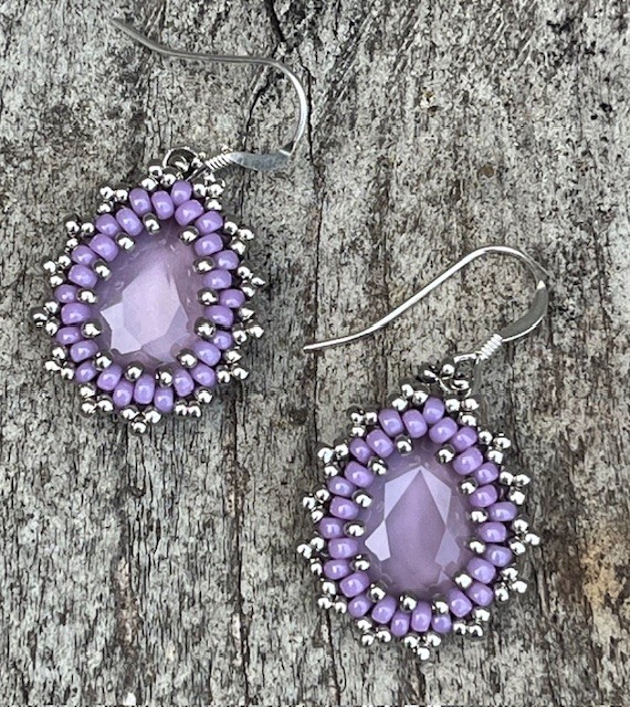 Dit is de iets kleinere versie van de Bling Drops oorbellen. Deze oorbellen zijn gemaakt met een lilakleurige facet glasdruppel in het midden, welke omrand is met 2 verschillende maten en kleuren Japanse Miyuki kraaltjes. De druppels zitten hierdoor stevig in een ‘jasje’ van kralen en hebben een kleine franje van dezelfde kraaltjes.