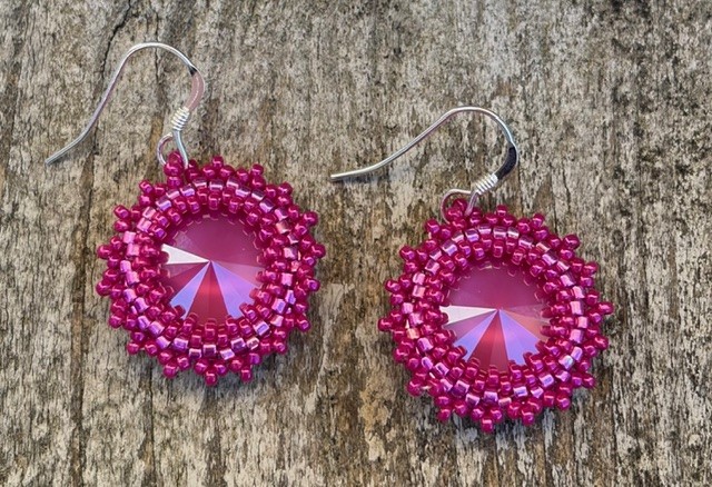 In het midden hebben deze oorbellen een mooie Swarovski crystal rivoli steen. Deze rivoli is vervolgens omrand met 2 verschillende soorten en kleuren Japanse Miyuki kraaltjes en ook aan de buitenrand zit een kleine franje van deze kraaltjes.