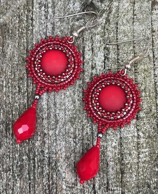 Deze oorbellen zijn naar eigen ontwerp gemaakt met in het midden een mat rode zgn. polaris cabochon (polaris is een hoogwaardige kunststof), welke omrand is met 2 verschillende soorten kleine Japanse Miyuki kraaltjes in bijpassende kleuren.
