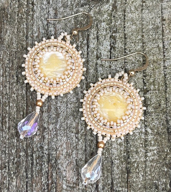 Deze oorbellen zijn naar eigen ontwerp gemaakt met in het midden een mooie gele zgn. polaris cabochon (polaris is een hoogwaardige kunststof), welke omrand is met 2 verschillende soorten kleine Japanse Miyuki kraaltjes in bijpassende kleuren.