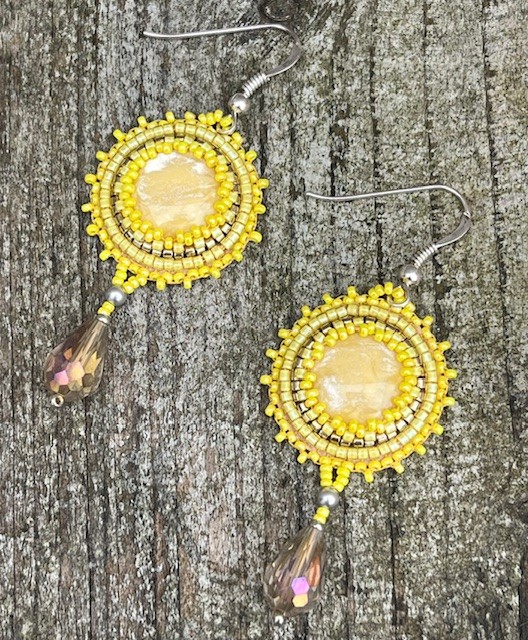Deze oorbellen zijn naar eigen ontwerp gemaakt met in het midden een mooie gele zgn. polaris cabochon (polaris is een hoogwaardige kunststof), welke omrand is met 2 verschillende soorten kleine Japanse Miyuki kraaltjes in bijpassende kleuren.